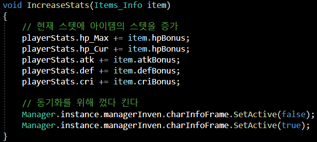 해당 장비의 스텟을 중가 시켜주는 IncreaseStats 함수입니다.