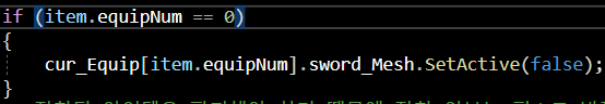 해당 장비의 sword_Mesh 오브젝트는 Setactive = false로 비활성화해주는 모습입니다.