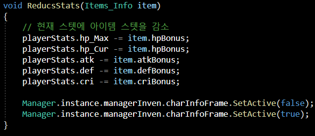 ReducsStats(cur_Equip [item.equipNum]) : 해당 아이템을 넣어 주어