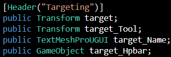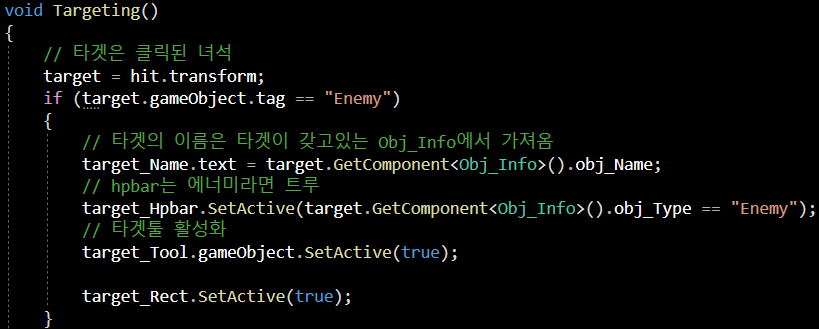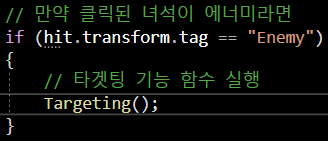 이 Targeting 함수는 hit.transform의 태그를 검사해서 타게팅을 실행시키는 함수입니다.