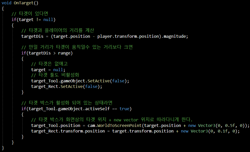 이 OnTarget() 함수는 Update문에서 실행됩니다.