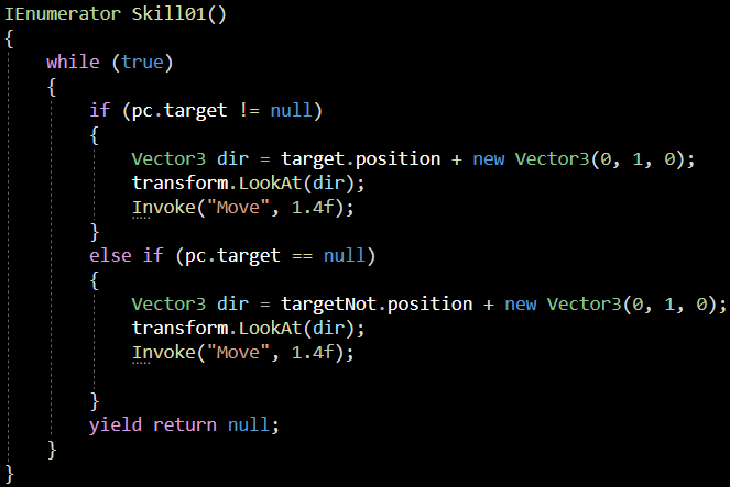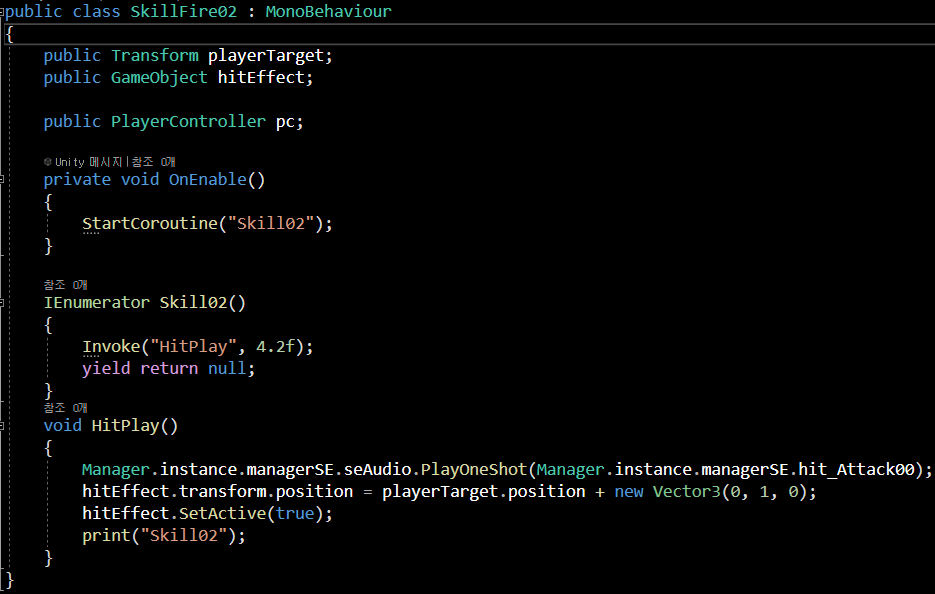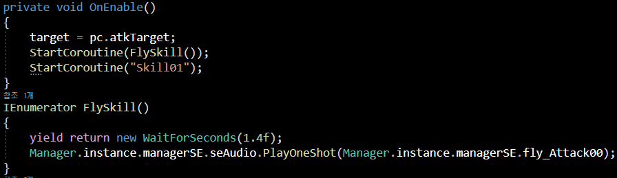 StartCoroutine("Skill01") 코드를 보겠습니다.
