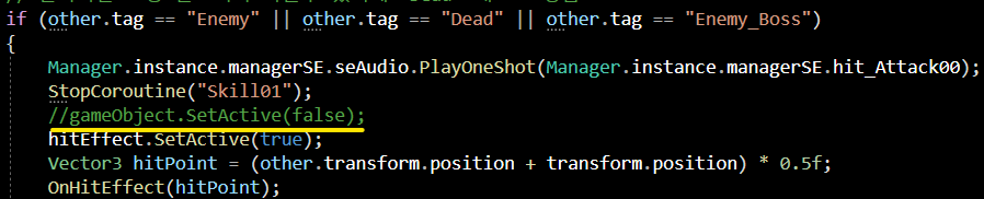 이후 hitEffect를 SetActive = true로 활성화를 시켜 줍니다.