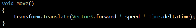 Translate로 Vector3.forward(앞 방향) * speed * Time.deltaTime으로 이동시켜주는 코드입니다.