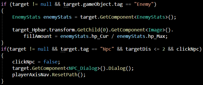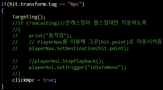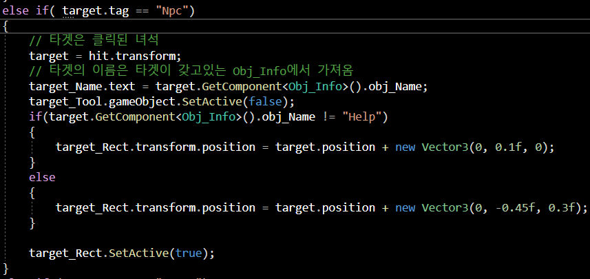 그 아래 target의 tag가 Npc 일 시의 조건문도 걸어주었습니다.