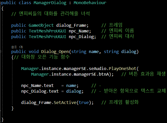 프레임 / 엔피씨 이름 / 엔피씨 대사를 public으로 선언하여 접근할 수 있게 선언했으며