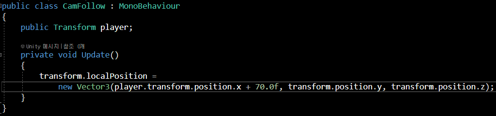 transform(카메라)의 위치는 (플레이어의 x축 + 70.0f / 본인의 y축 / 본인의 z 축)입니다.