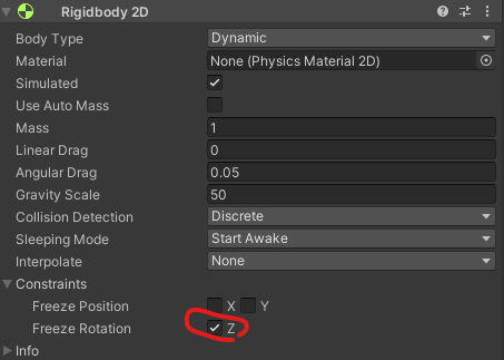 플레이어는 회전을 안 할 것 이기 때문에 Freeze Rotation z 값을 체크해 둬야 합니다.