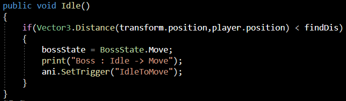 즉 추적 범위 안에 플레이어가 온다면 BossState의 값을 Move로 바꿔주는 코드입니다.
