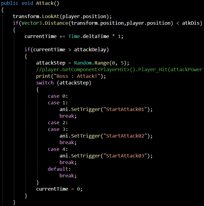 BossState의 값이 Attack일 때 실행되는Attack함수입니다.함수 입니다.