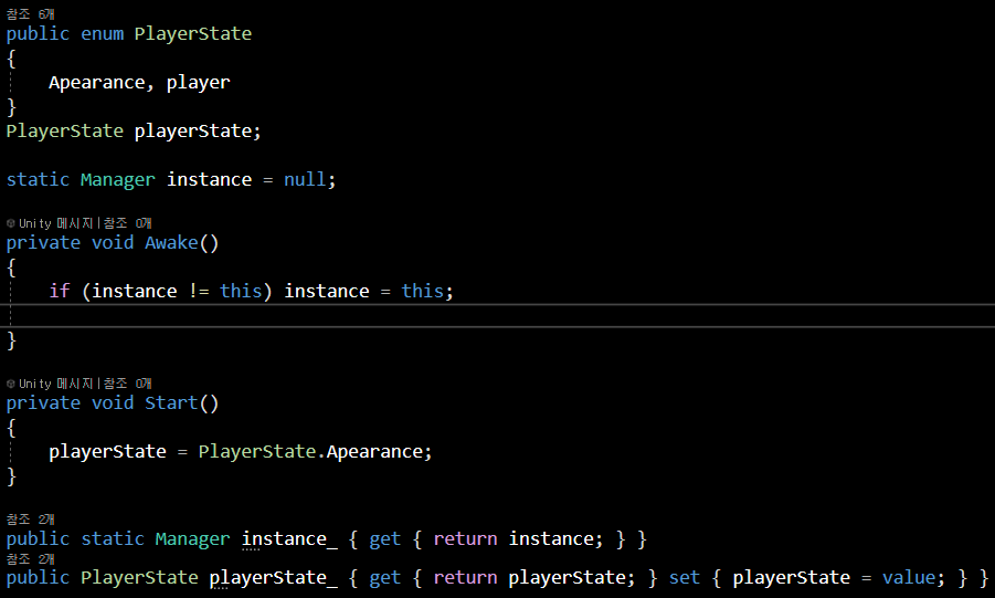 플레이어의 전체적인 상태 값을 설정하기 위해 Manager 스크립트에 플레이어의 상태 값을 추가해 주었습니다.
