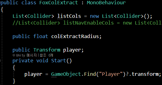 물론 이러한 구현을 원하시는 분들도 계시겠지만, 제가 원하는 건 플레이어의 일정 범위 내에 있는 콜라이더 추출이었습니다. 플레이어를 중점으로 받아오기 위한 선언입니다.)