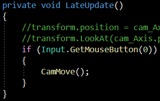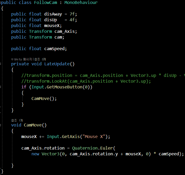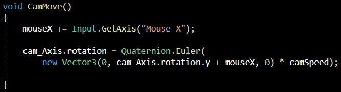 간단히 코드를 보자면 현재 cam_Axis의 y축 회전 값과 + Mouse X의 값을 받아오는 코드입니다.