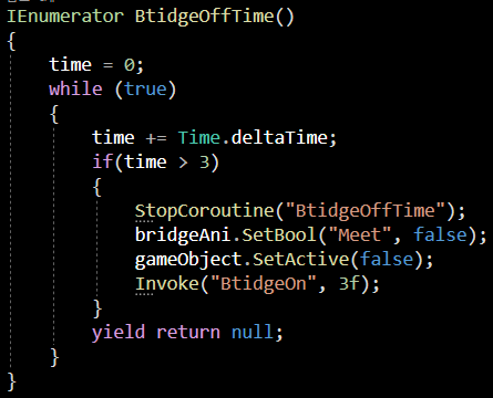 StartCorutine으로 코 루틴 함수 BtidgeOffTime을 실행시켜 주었습니다.