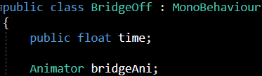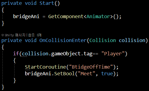 Start함수에서 애니메이터 컴포넌트를 bridgeAni에 받아와 주었으며