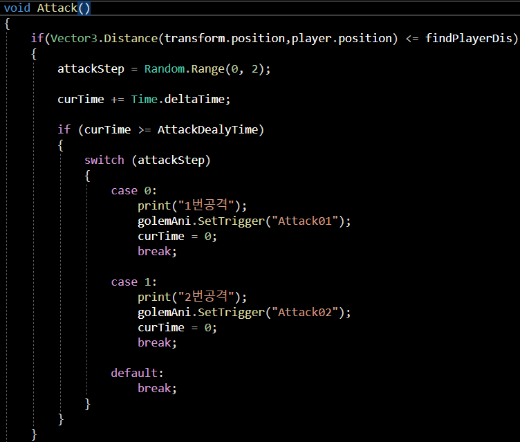 golemState 상태가 Attack일 때 실행할 Attack함수입니다.