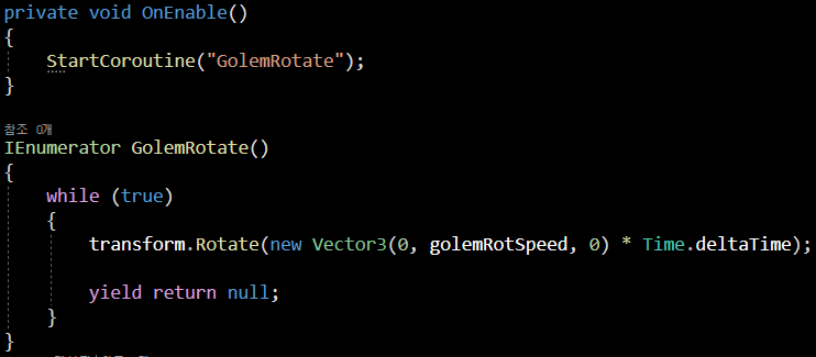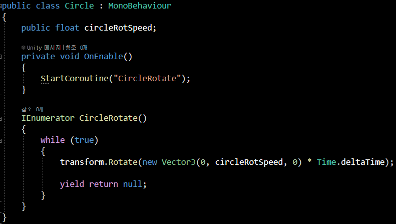 코루틴 함수에서 While문으로 transform(Circle)을 회전시켜 주는 코드입니다.