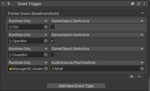 Open 버튼에도 Event Trigger의 Pointer Down을 이용하여