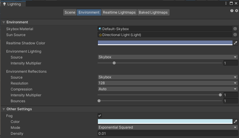 Lighting 시스템의 Fog의 값을 변경 하여 적용 해 주었습니다.