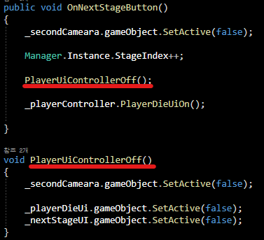 실패 했을시 ui항목을 꺼주는 PlayerUiControllerOff 함수도 재사용 해 주었습니다.