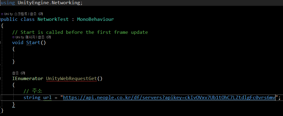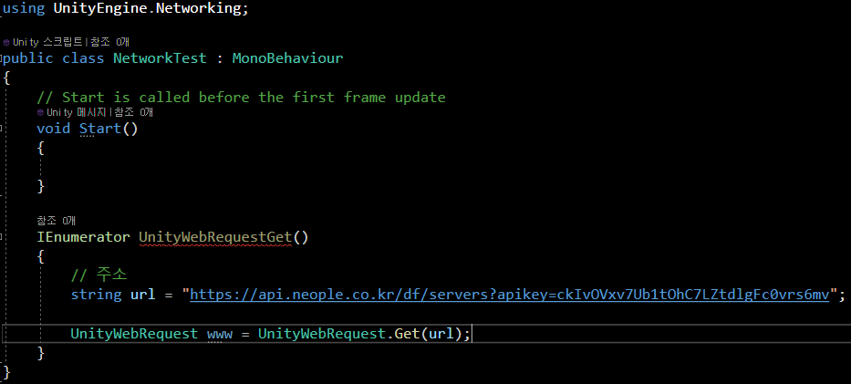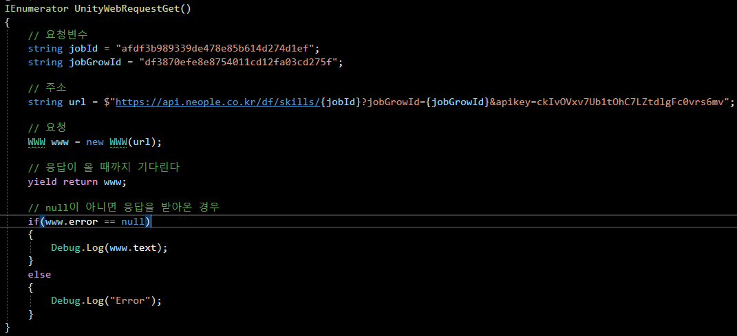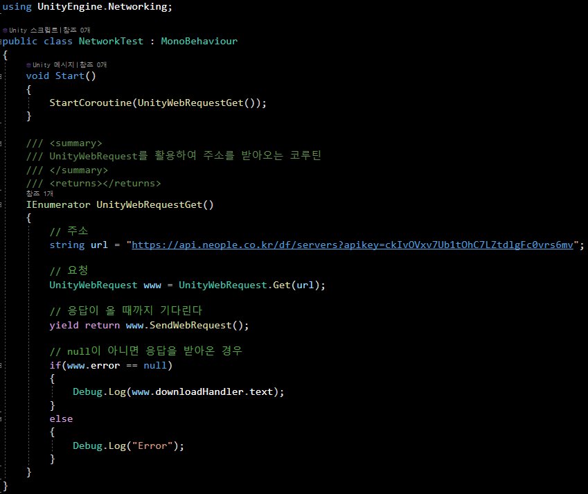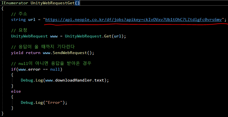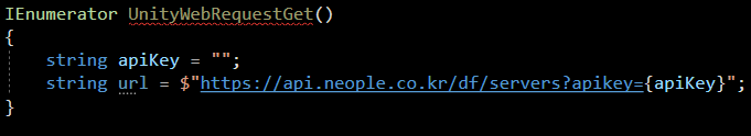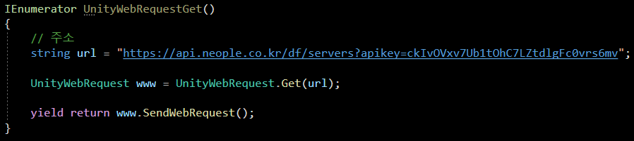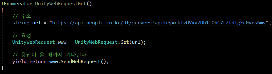 즉 UnityWebRequest 의 Get 방식으로 요청을 보내는 코드 이며