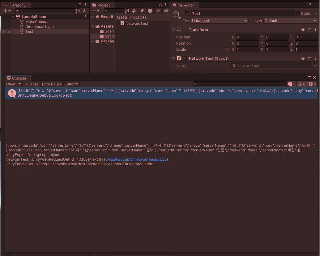 Test라는 빈 오브젝트를 하나 생성해 주어 NetworkTest 스크립트를 입혀 주었으며