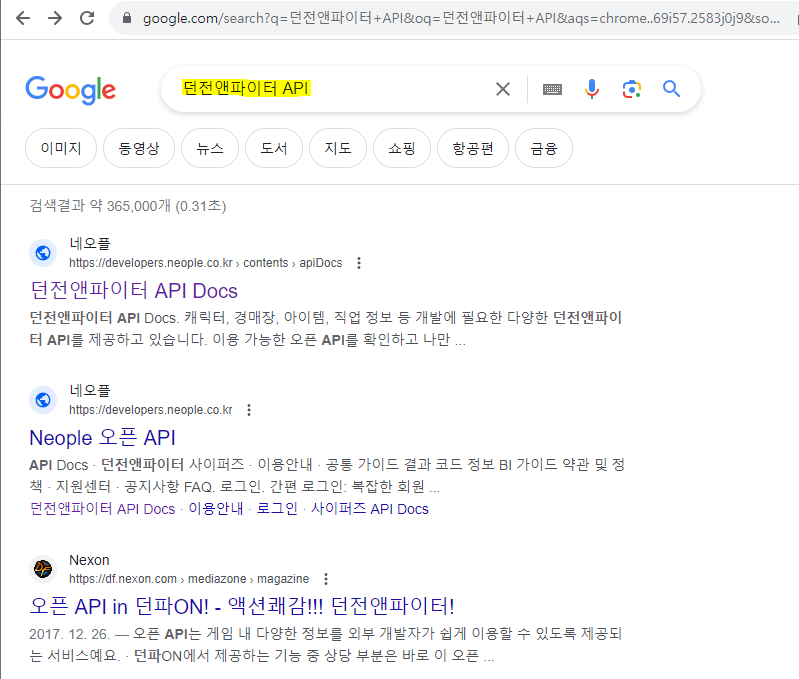 위 사진 처럼 던전앤파이터 API를 검색하여