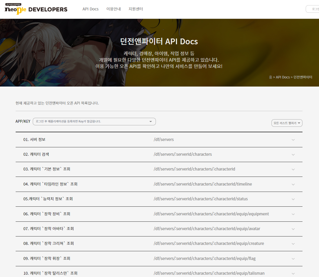 상단에 있는 "던전앤파이터 API Docs"를 들어가 보면