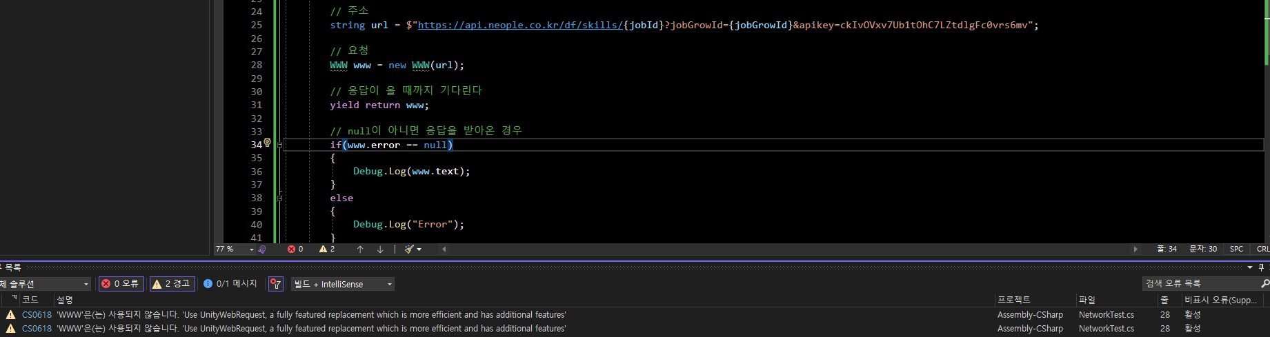 UnityWebRequest 으로 선언 해 주었던 부분을 WWW로 바꿔 주었고,